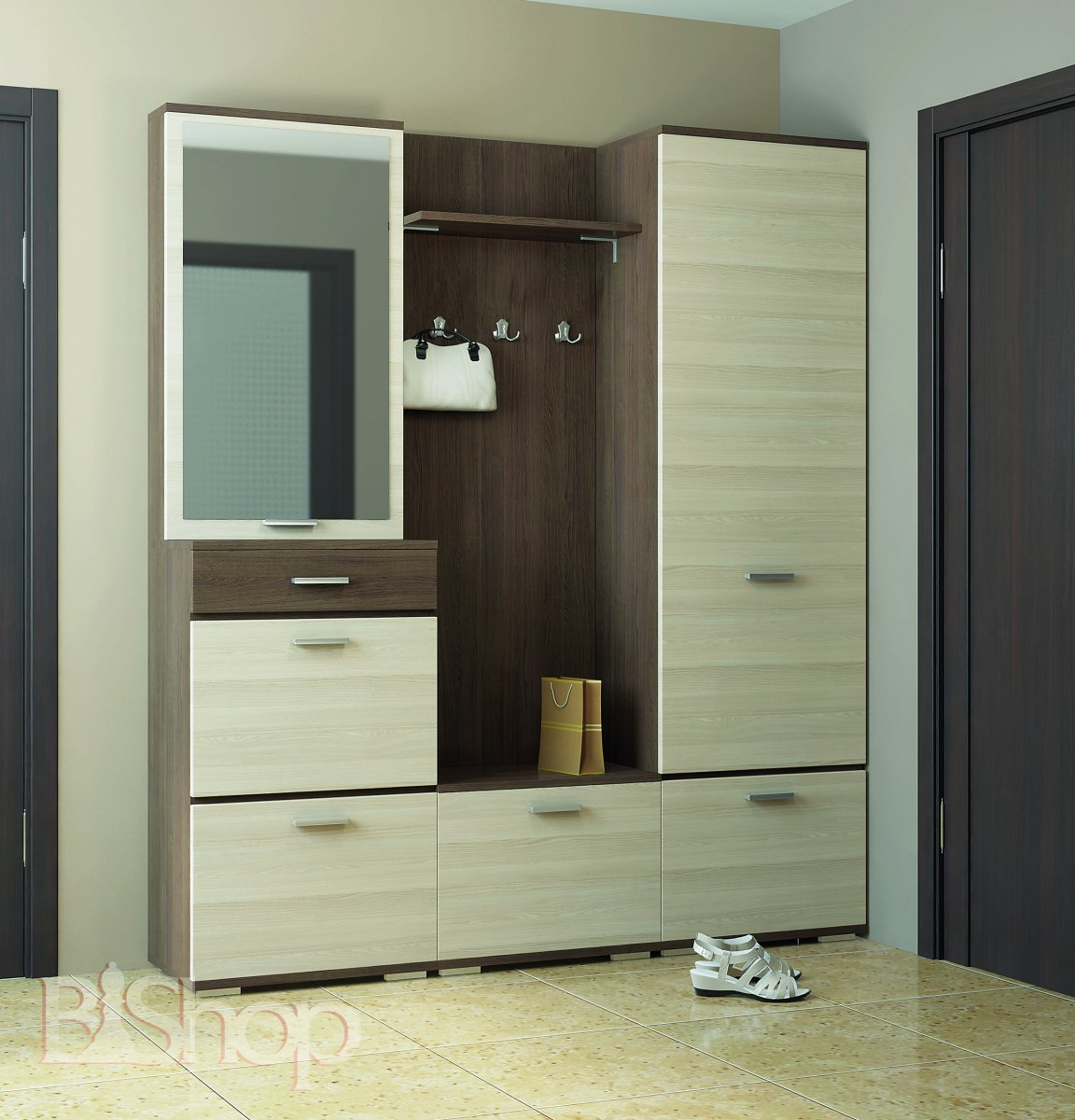 В комплект модулей Вива входят: большой шкаф, полки и несколько вместительных тумб, зеркало с правильной формой. Шкаф дополнена выдвижной вешалкой и внутренней полкой. Завершают композицию прочные металлические крючки.